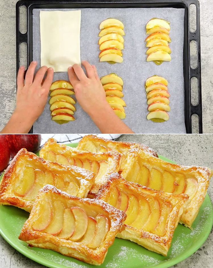 4. Nun noch etwas Honig zu den Äpfeln geben, anschließend auf jede Apfelpartie ein Rechteck Blätterteig legen.