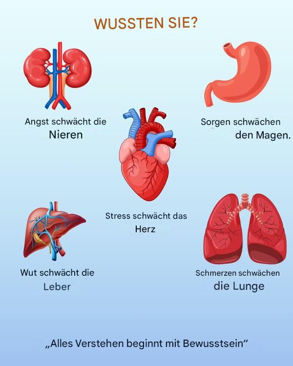 Emotionen beeinflussen nicht nur unseren Geist, sondern auch die Gesundheit unserer Organe. Laut der Traditionellen Chinesischen Medizin und verschiedenen ganzheitlichen Therapien ist jede Emotion mit einem bestimmten Organ verbunden, und ein emotionales Ungleichgewicht kann sich als körperliche Erkrankung manifestieren. Beispielsweise beeinträchtigen Stress und Angst oft Herz und Lunge, während anhaltende Traurigkeit die Lunge und das Immunsystem schwächen kann. Wut und Frustration stehen in engem Zusammenhang mit der Leber, und ständige Sorgen beeinträchtigen das Verdauungssystem, insbesondere Magen und Milz.